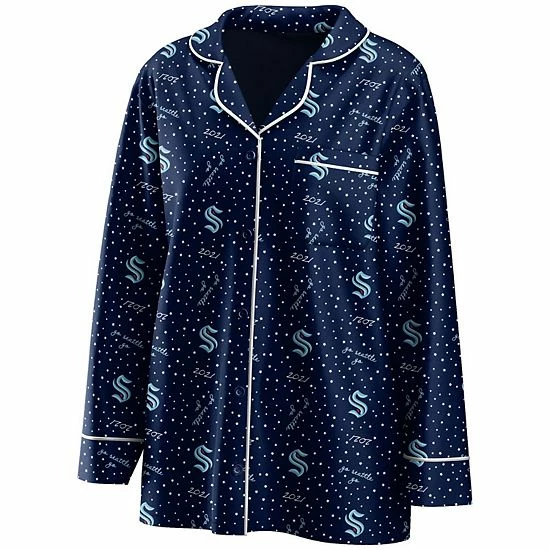 For your lazy game day pleasure, this WEAR by Erin Andrews sleep set is the perfect way to convey your Seattle Kraken spirit from home. It includes a cozy button-up shirt with a chest pocket and pants with an elastic waistband for the ideal fit, both with an allover polka dot and Seattle Kraken design. The soft material keeps you at ease during the game, and the relaxed fit offers a cute and comfy team look.