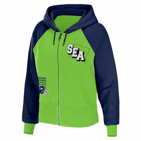 Upgrade your rotation of Seattle Seahawks gear with this Colorblock full-zip hoodie from WEAR by Erin Andrews. It features team lettering on top of an outline of the state that they play in, as well as a graphic of the team’s helmet near the hem. The adjustable hood on this midweight top allows you to stay warm, protected and ready to cheer on the Seattle Seahawks at all times.