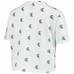 Dress fashionably on Michigan State Spartans game day in this Cropped Allover Print T-shirt. The soft fabric features the Michigan State Spartans logo in a repeating pattern from front to back. Everyone will easily see your collegiate allegiance when you wear this chic top.