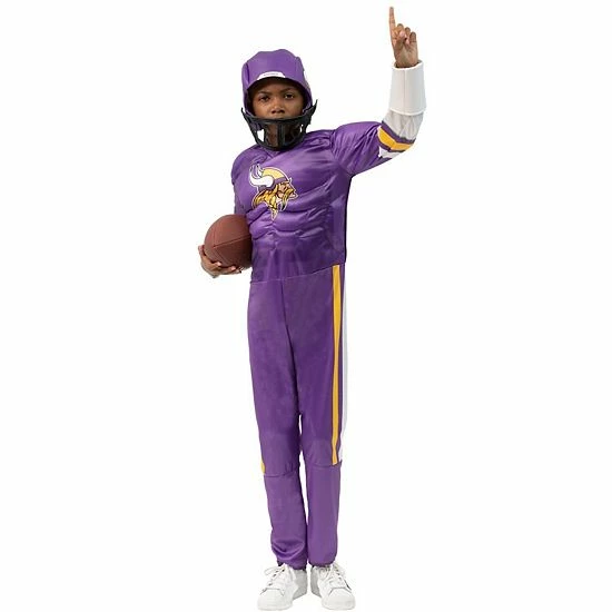 Transform into a true Minnesota Vikings player for Halloween or dress-up with this Game Day costume that celebrates human superpowers. The bodysuit features padded faux muscles, official Minnesota Vikings graphics and hook-and-loop closures for adjusting the size. Plus, polyester material creates a soft feel for hours of comfortable wearing.