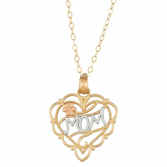 Featuring a scalloped, open-worked heart design, this tri-tone pendant is a charming tribute to Mom.